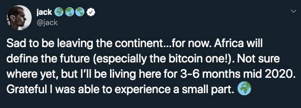 “A África definirá o futuro (especialmente o futuro do Bitcoin!)”, comentou Dorsey em sua mensagem. Ele também revelou que planeja passar seis meses no continente em 2020.