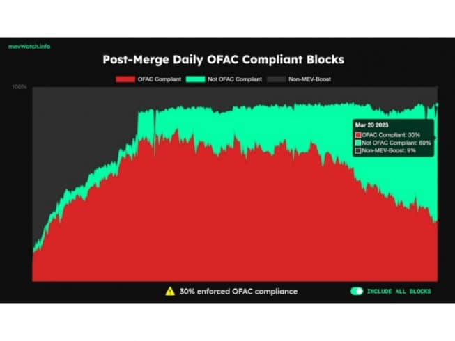 De acordo com o site MEV Watch, houve uma inversão em termos de blocos OFAC no Ethereum. Até poucos meses atrás, mais de 60% dos blocos continham alguma censura a transações. Mas durante o fim de semana passado e no início desta semana, somente um em cada três blocos que chegaram ao blockchain Ethereum era compatível com OFAC.