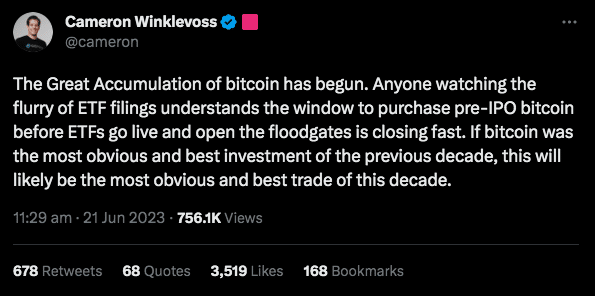 “A grande acumulação de Bitcoin começou. Qualquer pessoa que assista à enxurrada de registros de ETF entende que a janela para comprar Bitcoin antes dos ETFs chegarem está se fechando rapidamente. Se o Bitcoin foi o melhor e mais óbvio investimento da década passada, este provavelmente será o melhor e mais óbvio negócio desta década”, disse Winklevoss.