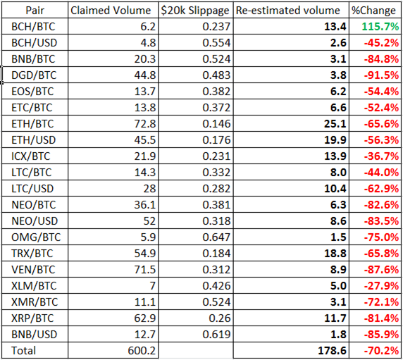 A proporção total de volume falsificado nesses pares seria, de acordo com este modelo, um escalonamento de 93,6%. Os pares descartados (slippage > 0,7%) não alterariam significativamente esse número de uma maneira ou outra.