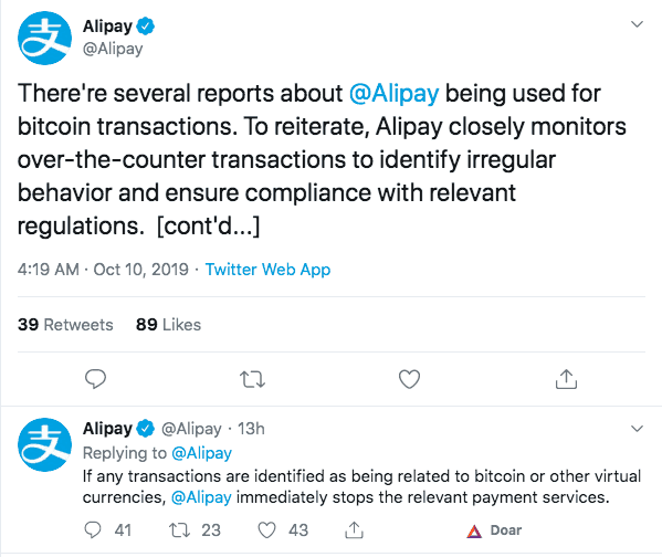 “Se alguma transação for identificada como relacionada ao Bitcoin ou outras moedas virtuais, o @Alipay interrompe imediatamente os serviços de pagamento relevantes.”
