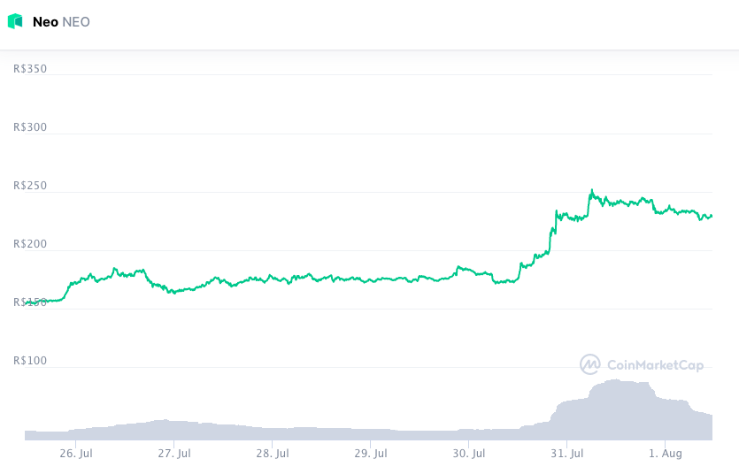 A NEO e sua valorização semanal de 47,42% conquistaram o bronze no pódio da semana. Apesar de operar em queda neste domingo (1), o preço da criptomoeda está cotado a R$ 228,94, enquanto seu valor de mercado chegou aos R$ 16,6 bilhões. No Top 100, a NEO fechou a semana na 34ª colocação.