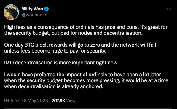 Portanto, quanto maiores as taxas, maior será o incentivo para os mineradores. E para seguir com taxas em alta, o Bitcoin precisa de novos tipos de uso. O comentário de Willy Woo está diretamente ligado à causa integral do aumento da taxa de rede, que são os Bitcoin Ordinals.