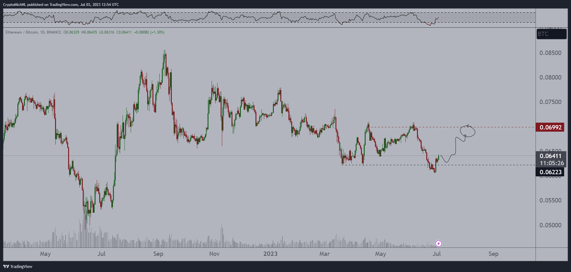 Van de Poppe prevê que o ETH continuará negociando em alta, desde que se mantenha acima de 0,062 BTC. Nesse sentido, o analista estima que o par ETH/BTC deve atingir pelo menos 10% de alta e seguir em direção a 0,07.