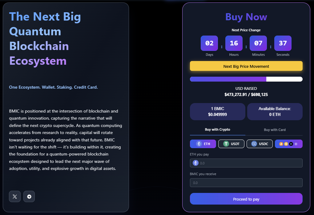 No entanto, enquanto traders aguardam esse momento, o capital continua migrando para projetos que resolvem problemas relevantes no longo prazo, não apenas movimentos de curto prazo. O fato de a pré-venda da BMIC ultrapassar US$ 500.000 neste período indica que investidores começam a enxergar a segurança quântica como uma prioridade.