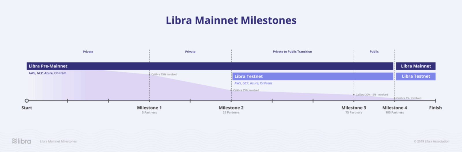 Para a primeira meta, a Associação espera atrair cinco parceiros implantando nós completos na rede. Com o lançamento da rede principal – que é a última meta – a Associação Libra espera que 100 parceiros executem os nós da Libra.