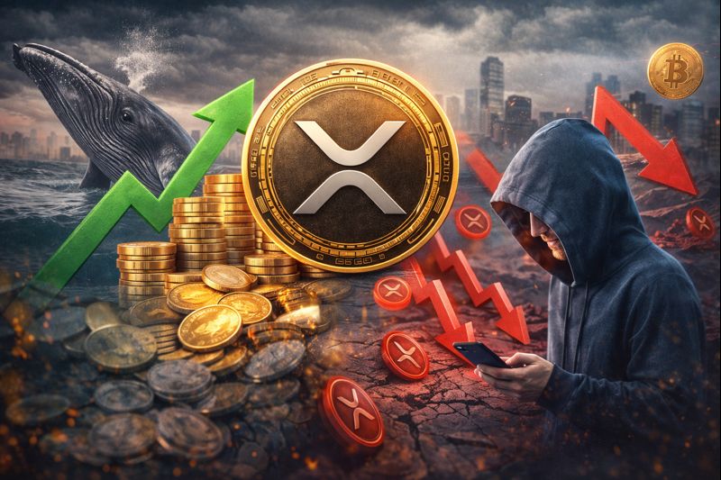 Em termos semanais, o XRP cai 6,8%, enquanto o volume médio diário recuou para cerca de US$3,1 bilhões, 22% abaixo da média de dezembro. Ainda assim, dados on-chain indicam comportamento assimétrico: baleias compram enquanto investidores menores vendem, padrão recorrente em fases de fundo do ciclo.