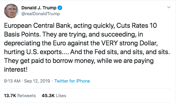 Quem não gostou nem um pouco da medida foi o presidente dos Estados Unidos Donald Trump. Após o anúncio do BCE, ele postou o seguinte tuíte: