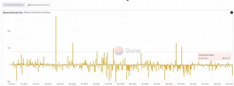 De acordo com a Dune Analytics, a Binance testemunhou um fluxo líquido negativo de US$ 623 milhões em 5 de junho. Ou seja, o equivalente a R$ 3,1 bilhões com base na cotação atual. O fluxo de saques foi o maior desde a crise bancária do início do ano.