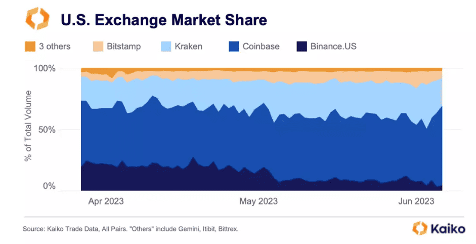 De acordo com dados apresentados pela empresa de análise Kaiko, a participação da Binance.US no mercado de criptomoedas dos EUA era de aproximadamente 20% em abril. No entanto, após os processos, esse dado caiu para menos de 5%.