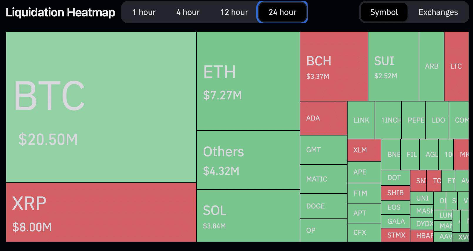 Nas liquidações, a queda foi de 31% e o volume total registrado chegou a US$ 69,1 milhões, com US$ 44 milhões vindos de posições compradas (long). O BTC liquidou as perdas de compra, enquanto a XRP causou a maior quantidade de prejuízos em quem apostou na queda a curto prazo.
