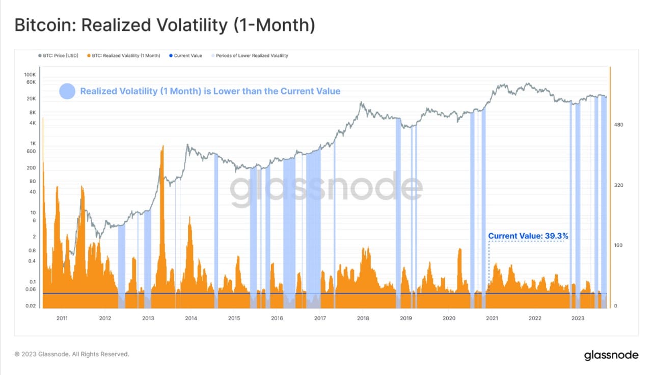 De fato, um dos indicadores mais utilizados para identificar momentos de mercado é a volatilidade realizada, geralmente numa avaliação mensal. Esse indicador reflete se o Bitcoin está numa zona de acumulação, que indica fundo, ou de distribuição, que geralmente indica topo.
