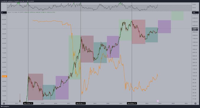 Com base em um gráfico compartilhado pelo analista, o preço do Bitcoin se move em uma sequência repetida marcada por um ano em que a moeda sofre intensa pressão de baixa. Em seguida vem outro ano de intensa acumulação, seguido por um ano definido por uma fase de alta.