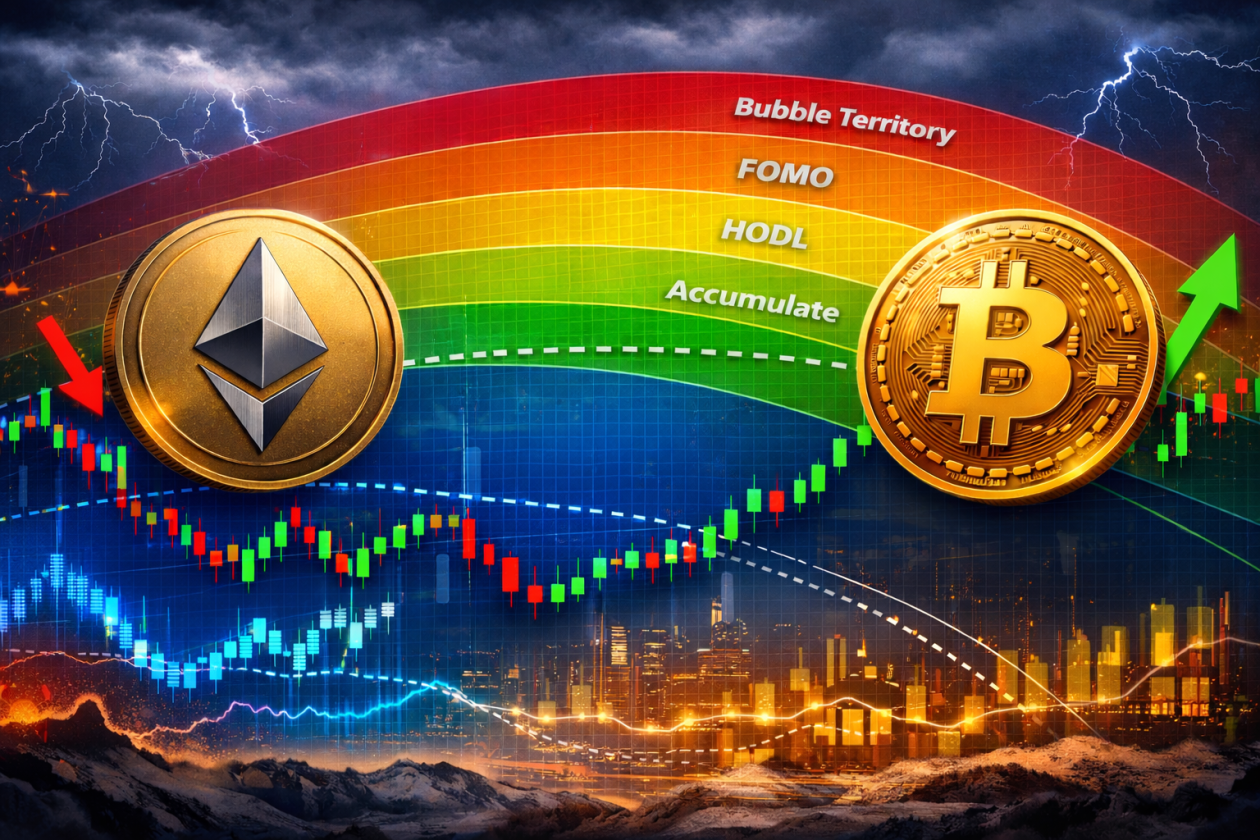 Em termos simples, o mercado reage a uma combinação de exaustão técnica e realização de lucros após o pico de agosto de 2025. O Ethereum, especificamente, tem enfrentado pressão vendedora que o empurrou de volta para zonas de suporte testadas pela última vez em anos anteriores. Para entender se o preço atual é uma oportunidade ou uma armadilha, analistas recorrem ao Ethereum Rainbow Chart. Esta ferramenta sobrepõe o preço histórico do ETH a curvas de crescimento logarítmico, dividindo as avaliações em bandas coloridas que vão de “Território de Bolha Máxima” a “Venda de Fogo” (profundamente subvalorizado).