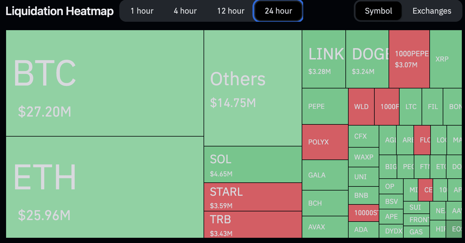 Desse total, US$ 85,8 milhões liquidaram posições de compra, enquanto US$ 36,7 milhões atingiram traders que apostaram na queda do mercado. O Bitcoin liderou as liquidações com perdas de US$ 27 milhões, e o Ether veio em segundo lugar com US$ 26 milhões.