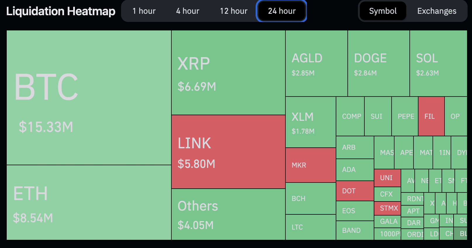 As liquidações, por outro lado, tiveram alta de 1,54% e abriram o dia com um volume total de US$ 66,7 milhões, com a maior parte (US$ 48 milhões) atingindo posições compradas. Novamente, Bitcoin e Ether lideraram as perdas causando grandes prejuízos a quem apostou em novas altas.