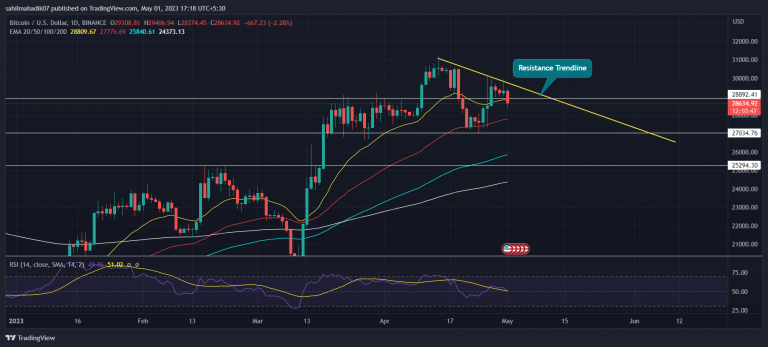 Só que unindo os picos dessas máximas, uma nova linha de tendência de resistência pode ser traçada para marcar a direção da fase de correção em andamento. Com uma queda de preço significativa hoje, o preço do BTC caiu abaixo do suporte local de US$ 28.875.