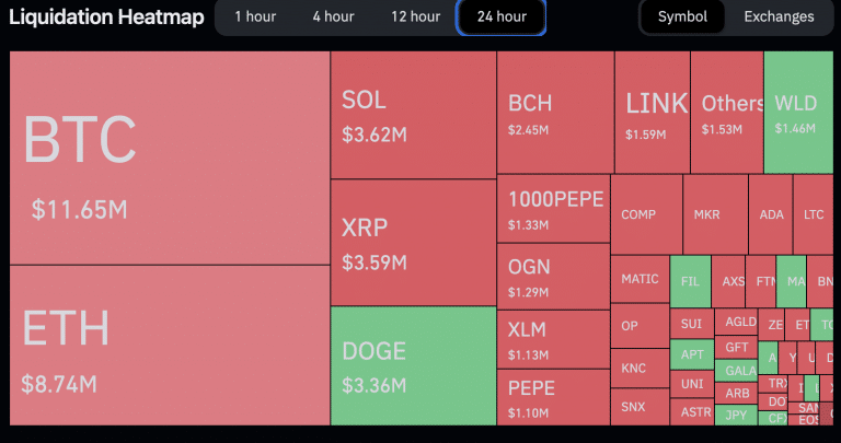 Ao mesmo tempo, as liquidações alcançaram US$ 52,3 milhões, alta de 31% nas últimas 24 horas, dos quais US$ 36 milhões partiram de posições vendidas. O BTC e o ETH lideraram o mercado acumulando liquidações superiores a US$ 20 milhões.
