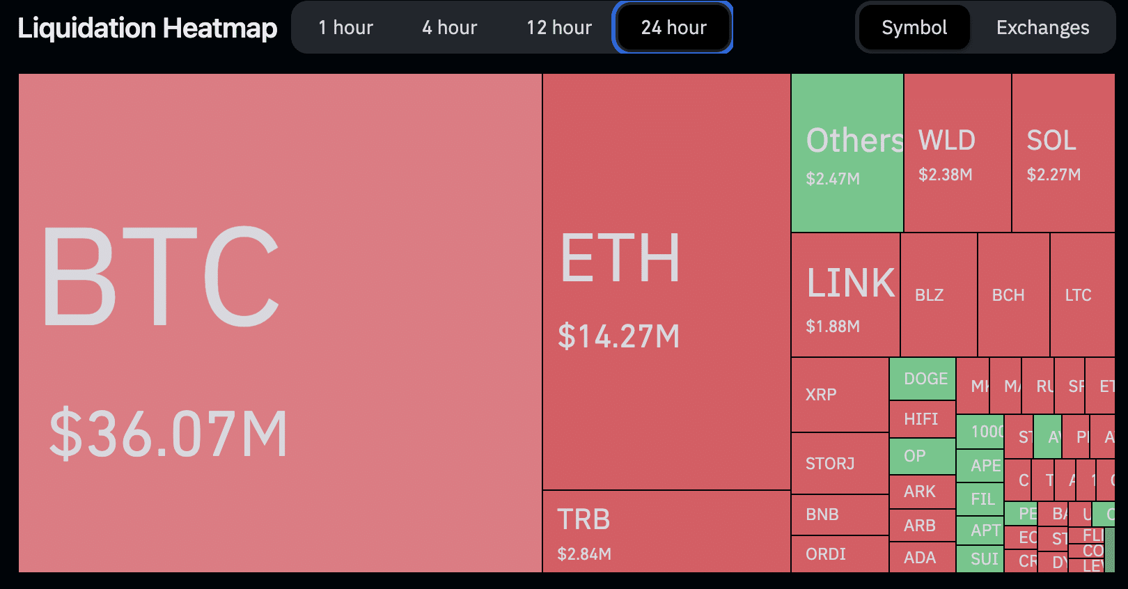 Já as liquidações alcançaram um volume de US$ 75,5 milhões, mas registraram uma alta de apenas 1,5% nas últimas 24 horas – US$ 43,8 milhões representam posições vendidas. O Bitcoin registrou a maior parte das liquidações, movimentando um total de US$ 36 milhões.