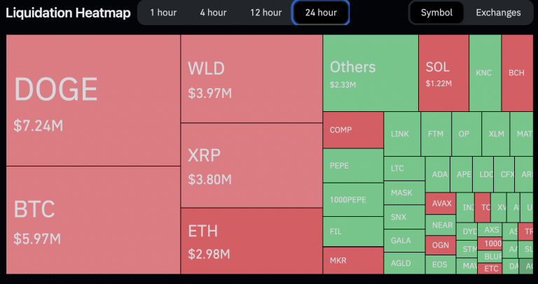 As liquidações caíram 13% e chegaram a US$ 39,8 bilhões, dos quais US$ 20 milhões vieram de posições vendidas. Dessa vez quem liderou o movimento foi a DOGE, que causou perdas de US$ 7,24 milhões para quem apostou na queda da memecoin.
