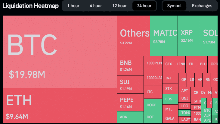 No lado das liquidações, o volume total caiu 65,7%, o que fez as liquidações chegarem a um total de US$ 55,7 milhões. A maior parte delas (US$ 36,5 milhões) veio de posições vendidas e outros US$ 19,25 milhões atingiram quem estava comprado no mercado. O BTC movimentou a maior quantidade de liquidações, seguido do ETH.
