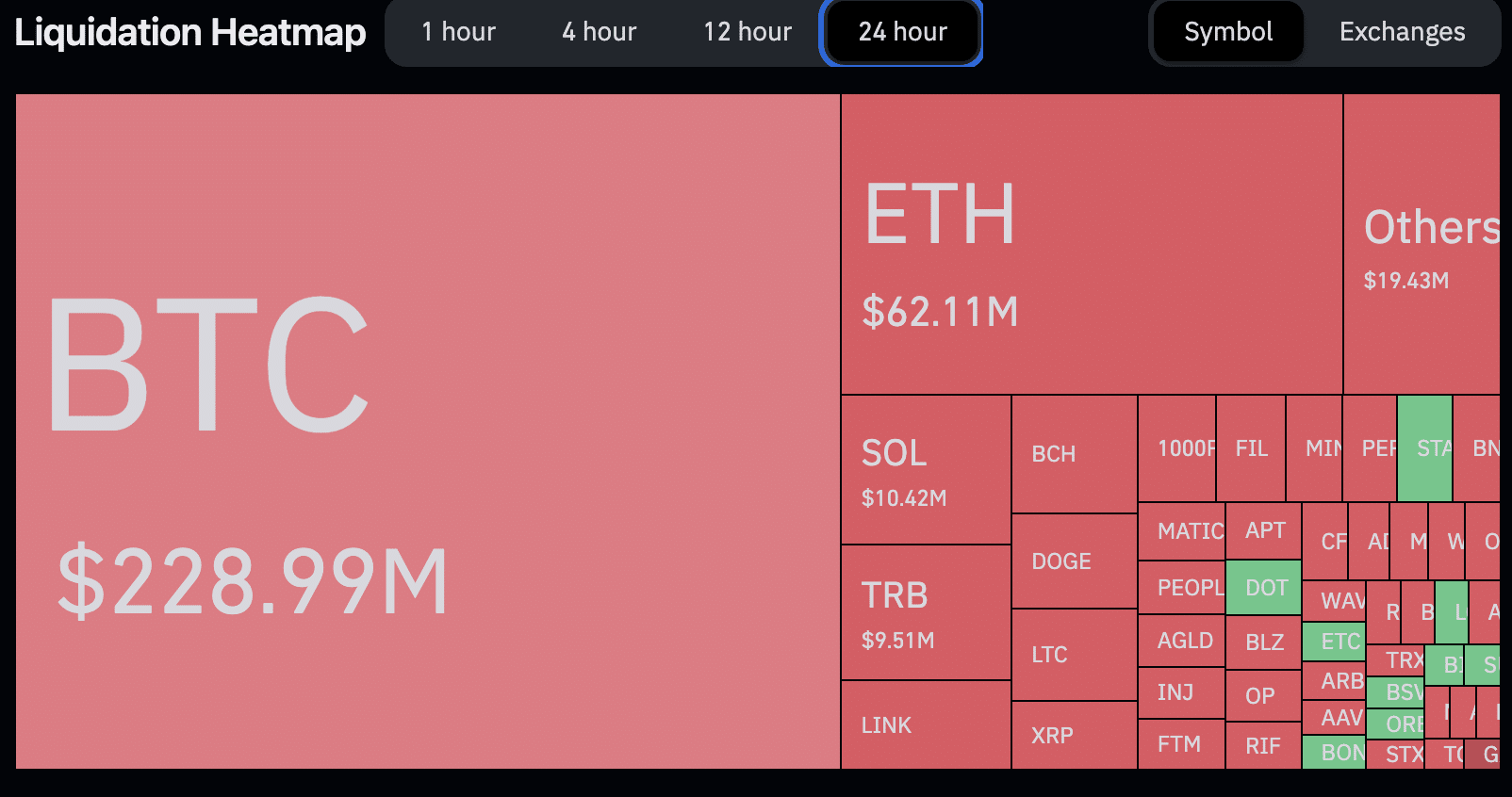 Já as liquidações superaram o volume total de US$ 411 milhões, com alta de 244% em 24 horas, e a grande maioria do volume (US$ 311 milhões) veio de posições que apostaram na queda do mercado. O BTC respondeu por US$ 229 milhões deste total, enquanto as liquidações de ETH varreram do mercado posições de US$ 62 milhões.