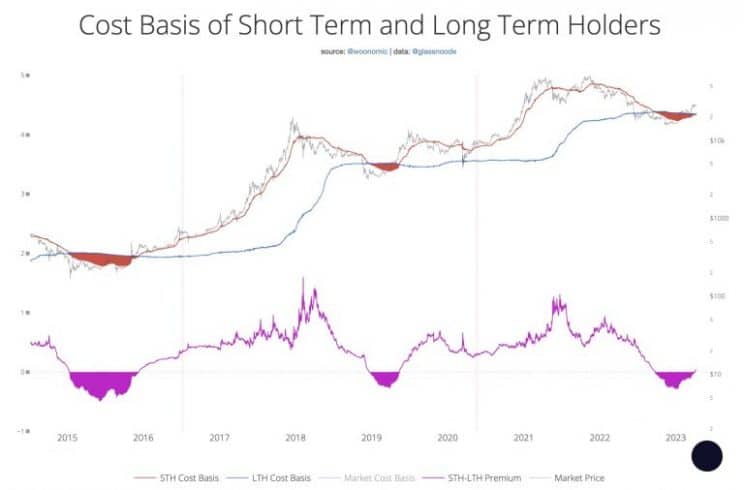 Em seguida, Woo aponta outro indicador: análise de custo-base dos detentores de curto e longo prazo, ou STH-LTH. Quando este indicador está acima de zero, ele indica alta entre os investidores. E, de acordo com o gráfico abaixo, o STH-LTH ficou acima de zero pela primeira vez no ano.