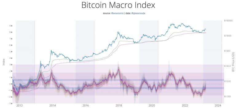 Em primeiro lugar está o Bitcoin Macro Index, que cruzou acima da faixa azul inferior. O cruzamento, segundo Woo, indica o reinício a fase de “reacumulação” do ciclo do Bitcoin. Isto é, quando os investidores voltam a comprar com foco no longo prazo.