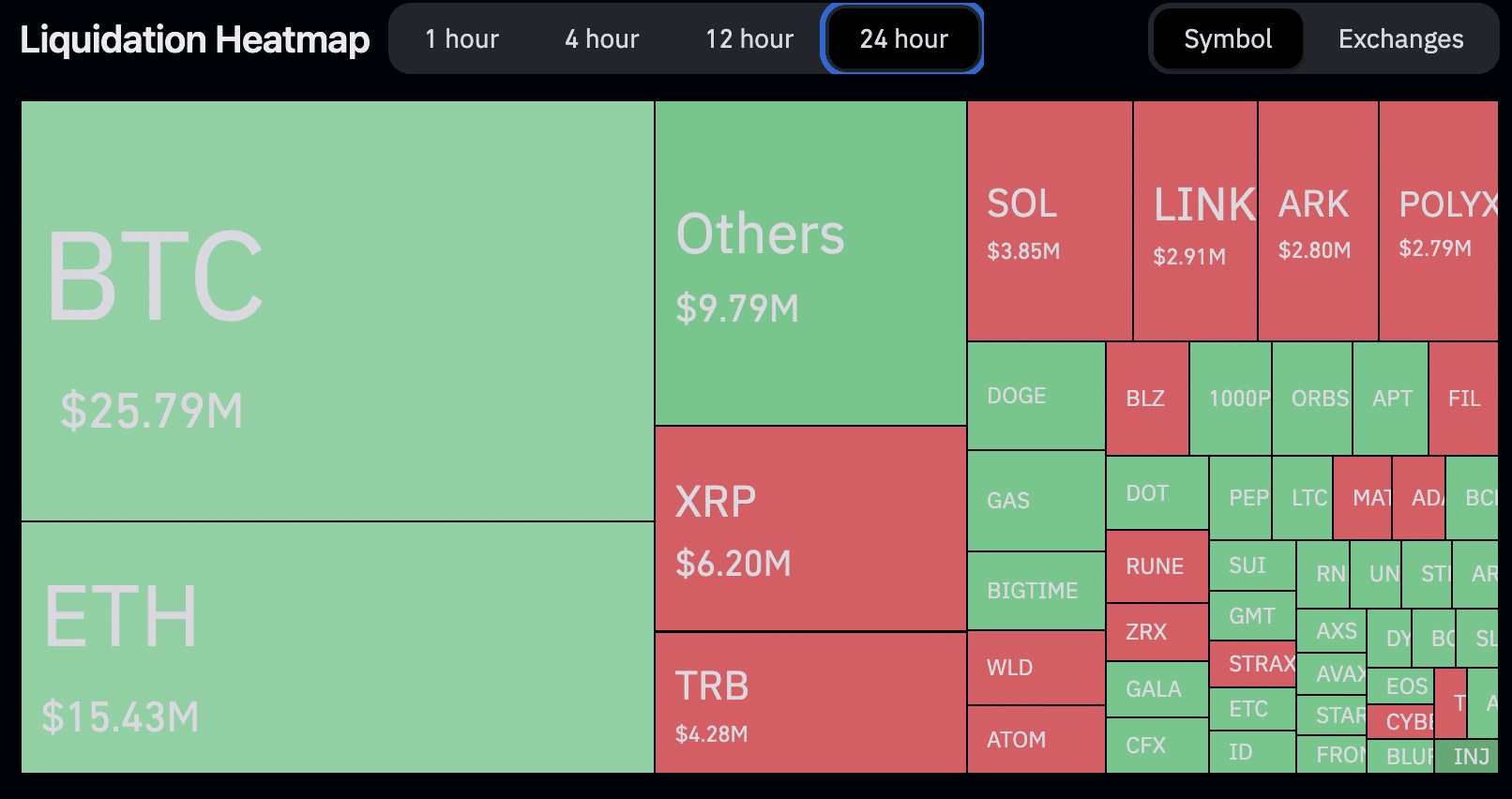 Por outro lado, as liquidações tiveram alta de quase 27% em seus volumes, atingindo movimentações superiores a US$ 96 milhões. Desse total, US$ 58 milhões liquidaram posições compradas, com destaque para o Bitcoin, cujo volume de liquidações atingiu US$ 25,8 milhões.