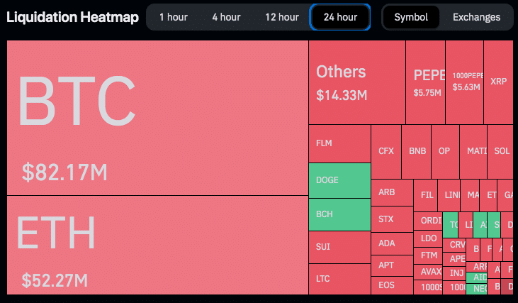 As liquidações aumentaram em 23%, chegando a US$ 225 milhões, dos quais US$ 144,8 milhões atingiram posições vendidas (short). Esse dado corrobora a tese de que quem apostou na queda do Bitcoin nos últimos dois dias sofreu fortes prejuízos. E de fato, as liquidações de Bitcoin superaram a marca de US$ 80 milhões.
