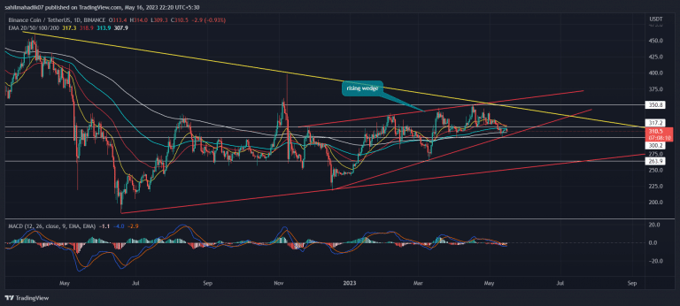 Nos últimos seis meses, o preço do BNB entrou em tendência de alta sob a influência de um padrão de cunha crescente. De acordo com o padrão, o criptoativo da Binance se recuperou três vezes da linha de tendência ascendente.