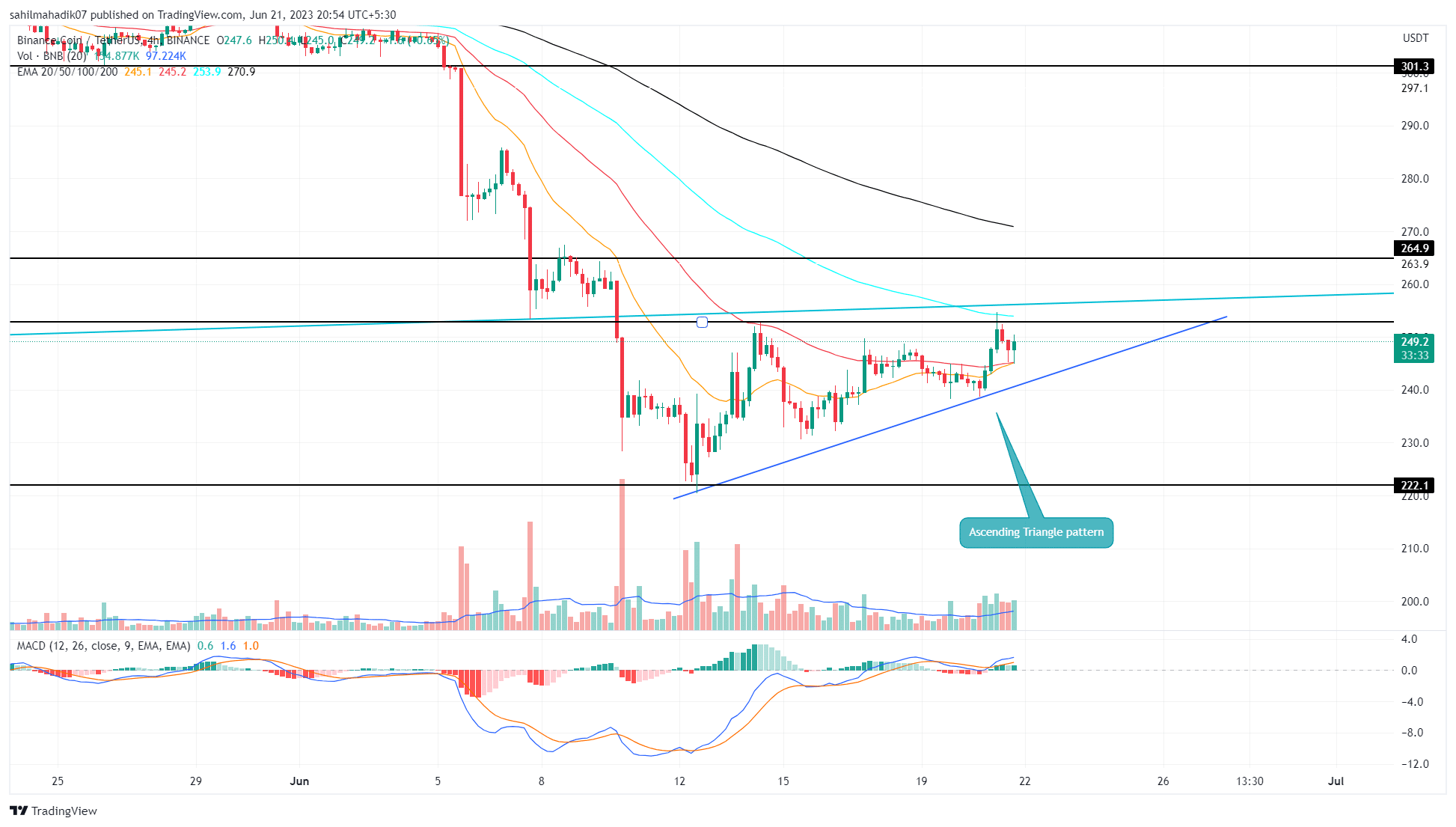 A venda de 10 de junho no preço do BNB deu uma quebra maciça da linha de tendência de suporte do padrão de triângulo simétrico. Essa quebra deveria aumentar ainda mais a queda, mas com a disparada do Bitcoin (BTC) e a volta do sentimento positivo, o preço do BNB sofreu um ligeiro desvio.