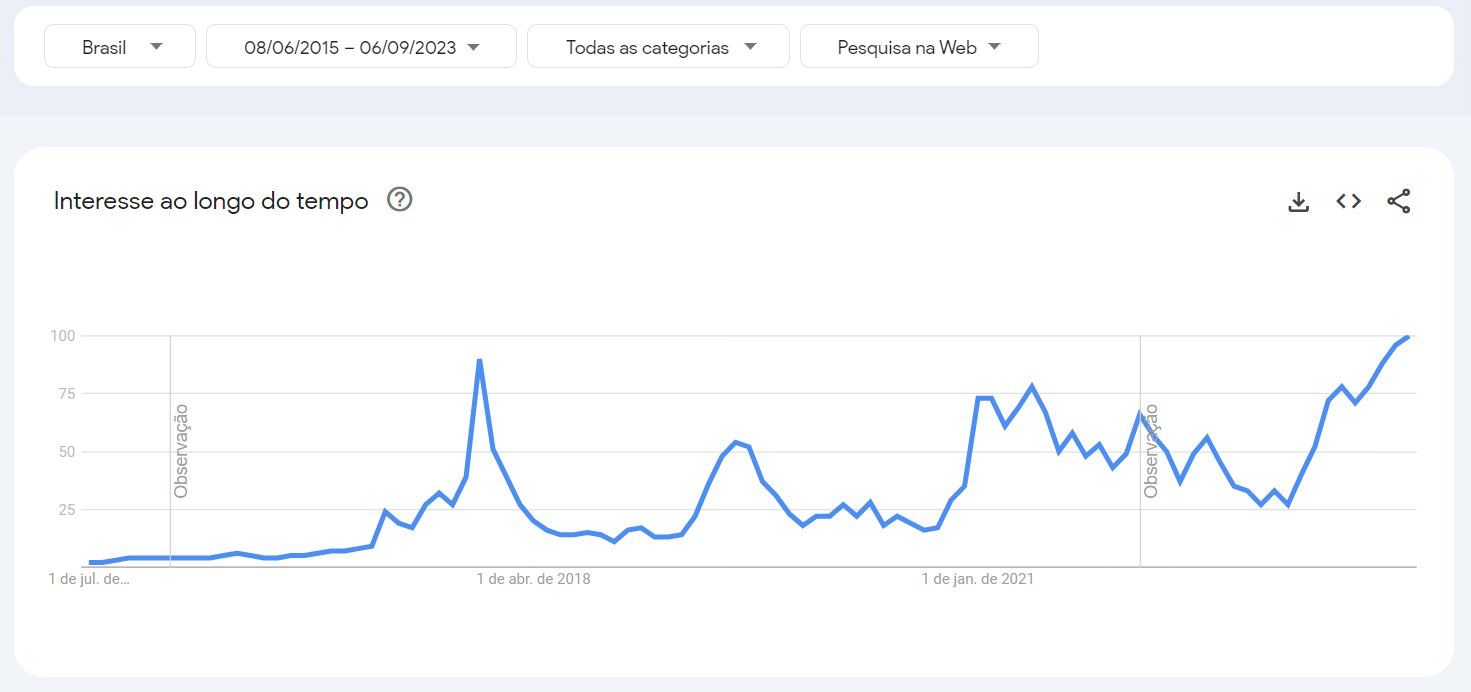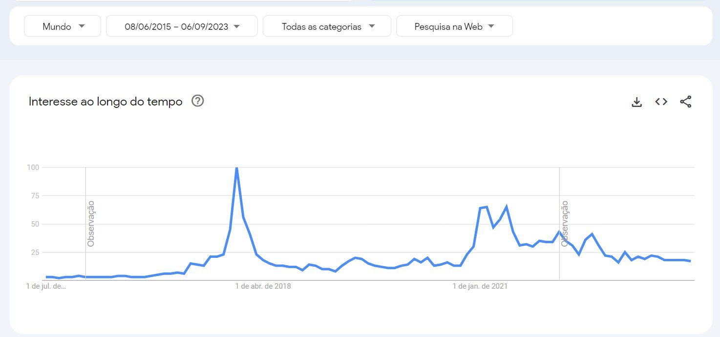 Conforme visto anteriormente, o momento de indecisão do mercado em termos de preço se reflete nas buscas por termos relacionados a criptomoedas no Google. Afinal, quando o mercado está em tendência de baixa, o desinteresse do público tende a ficar maior.