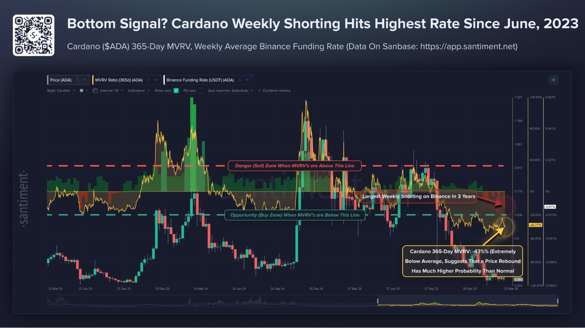 A relação MVRV de 365 dias do Cardano caiu para -43%, enquanto as taxas de financiamento na Binance registraram o maior volume semanal de posições vendidas desde junho de 2023. Para quem acompanha métricas on-chain, ambos os números indicam um clássico sinal de fundo.