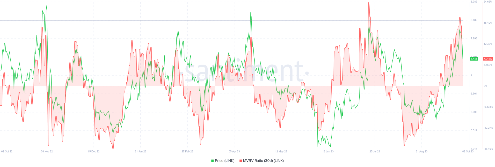 Com base nos dados da Chainlink configurados após a recuperação do preço da LINK, alguns analistas de mercado esperavam uma correção. Isso se baseia no valor de mercado frente ao valor realizado (MVRV) avaliado pelo gráfico da Santiment.
