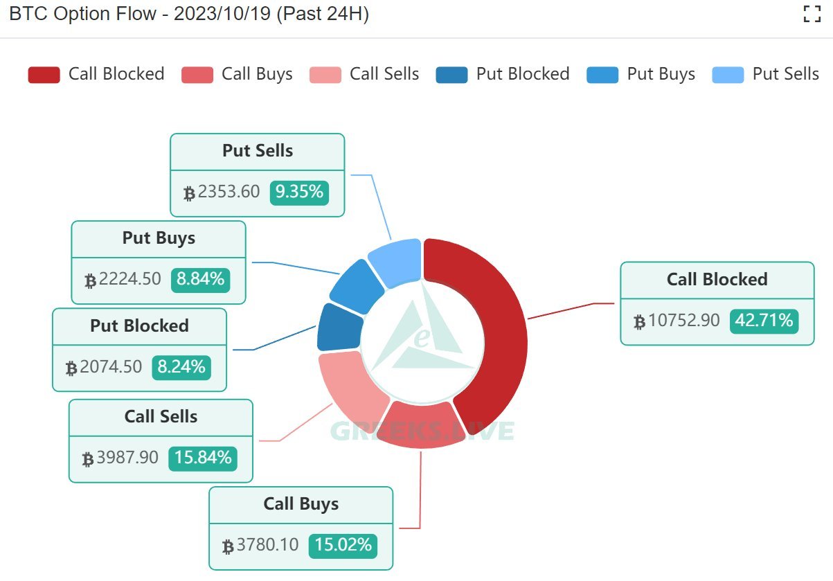 No total, o bloco de opções um valor combinado de quase US$ 300 milhões, representando mais de 40% da atividade total de opções do dia. A estratégia dominante envolveu um spread diagonal de venda do contrato “BTC-3NOV23-29000-C” e um spread diagonal de compra “BTC-29DEC23-34000-C”.