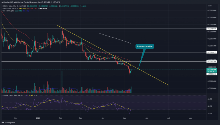No entanto, com a recente valorização no mercado de criptomoedas, é provável que os compradores desafiem novamente a linha de tendência de resistência. Ou seja, façam um movimento que determine se o preço da LUNC prolongará essa correção ou desencadeará um novo rali de alta.