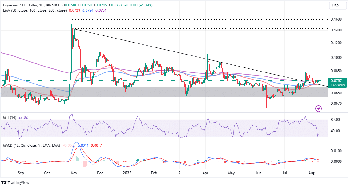 O preço da DOGE está prestes a validar uma reversão de tendência de alta, depois de enfrentar uma rejeição em US$ 0,085 e manter um suporte de confluência em US$ 0,72. Esses dados se baseiam nos comportamentos da Média Móvel Exponencial de 50 dias (EMA) (vermelho) e pela EMA de 100 dias (azul).