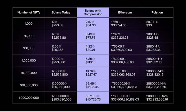 Segundo a Solana, a compactação pode permitir a cunhagem de 100 milhões de NFTs compactados pelo mesmo preço que 10 mil. Além disso, a compressão pode reduzir os custos de emissão para menos de 2% do que eles custam no Ethereum.