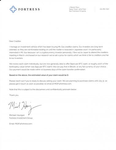 “Caro credor. Eu gerencio um veículo de investimento que deseja comprar os direitos dos bitcoins que os clientes da Mt. Gox possuem. Analisamos cada reivindicação individualmente, mas agora somos capazes de oferecer US$900 por Bitcoin, ou aproximadamente 200% do valor do ativo no momento da falência (que era de US$451 por sinistro de BTC) (sic). O pagamento pode ser feito em Bitcoin ou qualquer moeda fiduciária de sua escolha. Nosso pagamento será feito em até 10 dias úteis após a confirmação da transferência do pedido.”