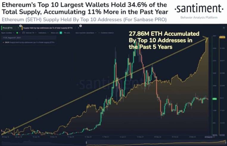 A plataforma de análise de dados on-chain Santiment fez uma análise dos dez maiores endereços da rede Ethereum em número de Ether (ETH). E, de acordo com os daods da empresa, essas dez maiores carteiras detêm quase 35% da oferta total da criptomoeda.