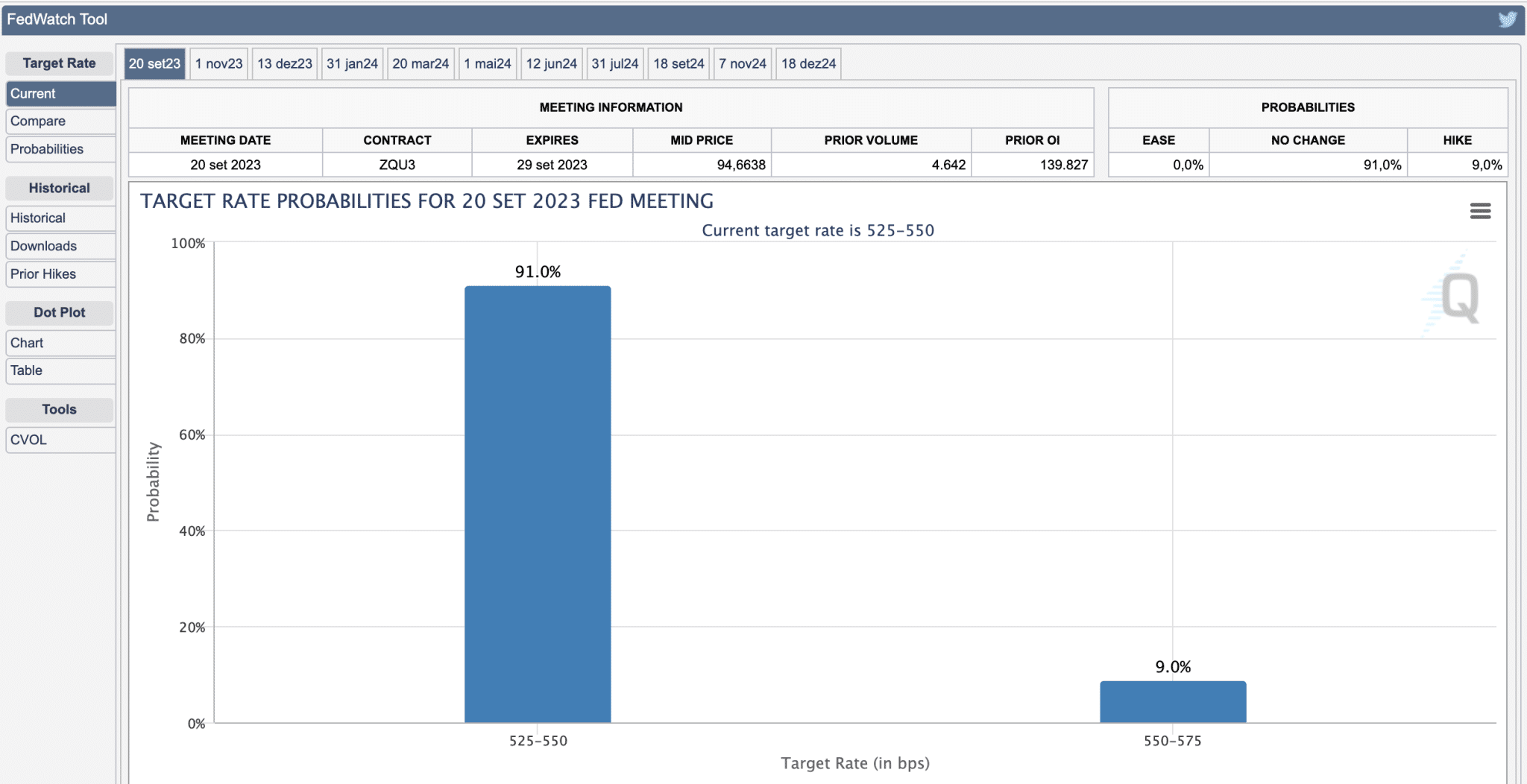 O presidente do Fed, Jerome Powell, disse que iria analisar os dados de inflação e empregos para tomar sua próxima decisão. A opinião de 91% dos analistas é que o Fed mantenha os juros entre 5,25 e 5,5% na reunião da próxima quarta-feira (20). Mas 9% dos analistas apostam que o Fed pode realizar um novo aumento na taxa. Ninguém espera que haja um corte de juros, de acordo com a ferramenta FedWatch.