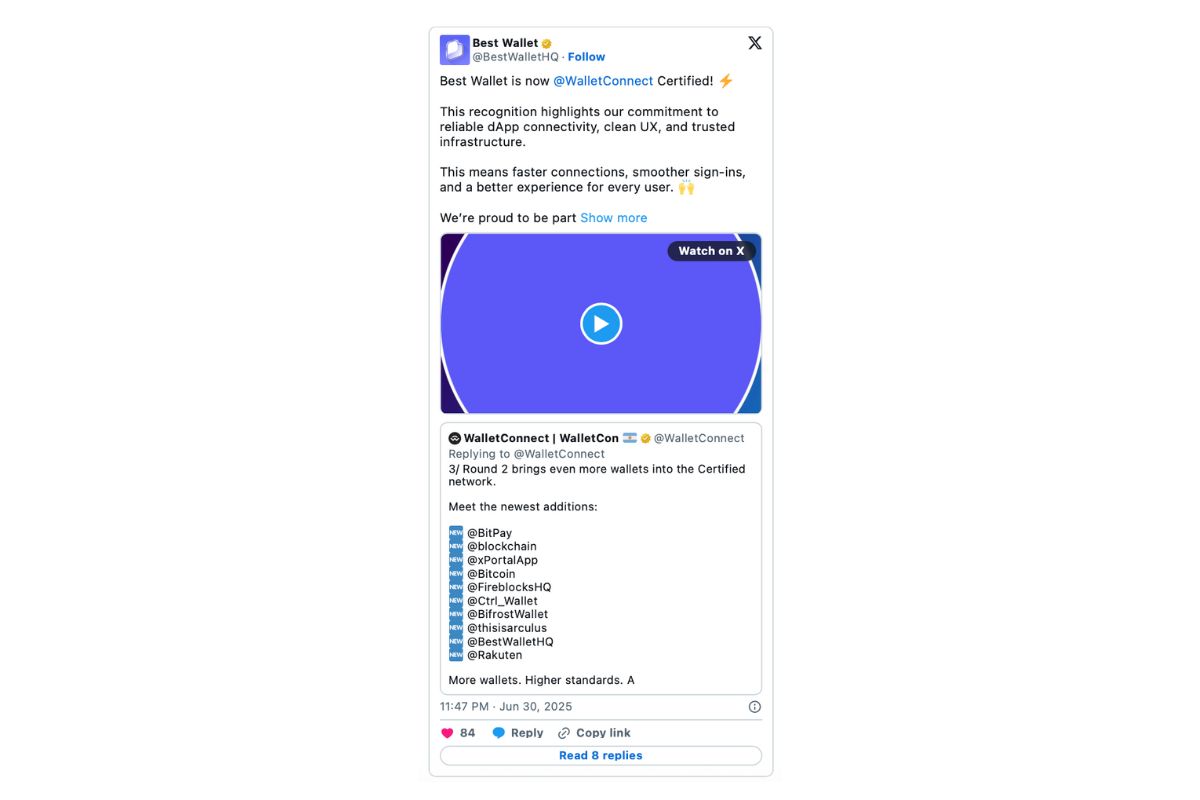 Em 2025, a Best Wallet recebeu a certificação oficial da WalletConnect, um selo que reconhece carteiras que cumprem os mais altos padrões de segurança e interoperabilidade no ecossistema Web3.