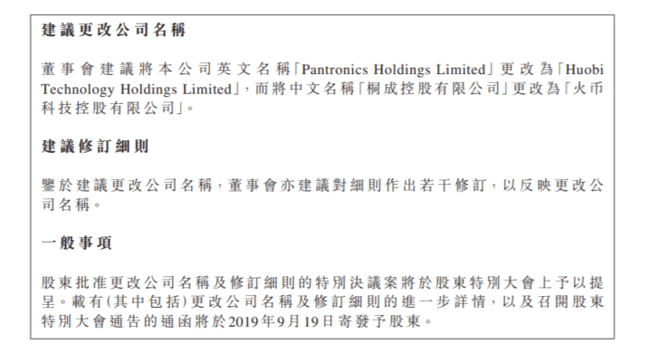 No documento, publicado em 10 de setembro, a fabricante de eletrônicos Pantronics Holdings Limited, listada na bolsa de Hong Kong e adquirida pela Huobi em agosto, divulgou que mudará seu nome para Huobi Technology Holdings Limited. Com a manobra, a Huobi pode fazer sua IPO de forma indireta por meio desta companhia.