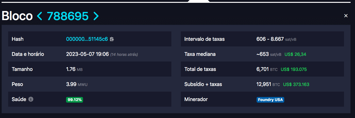 De acordo com a Mempool do Bitcoin, o bloco em questão rendeu 6,701 BTC em taxas, ou aproximadamente R$ 928 mil, enquanto a recompensa é de 6,25 BTC (R$ 865 mil). Como resultado, o minerador recebeu 12,951 BTC no total (R$ 1,79 milhão).