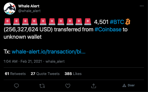 Uma série de transações oriundas da exchange Coinbase foram identificadas neste final de semana. Elas foram divulgadas pelo Whale Alert, perfil que rastreia grandes movimentações de criptomoedas.