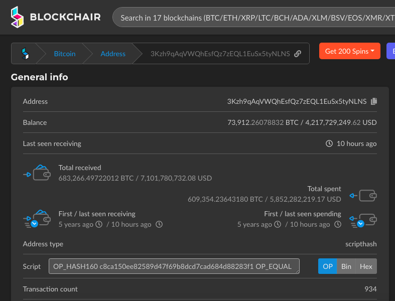 Essa hipótese é reforçada pelo endereço que recebeu a transação de 4,5 mil Bitcoins. A carteira possui mais de 73 mil BTCs sob custódia – cerca de R$ 22,6 bilhões na cotação atual.