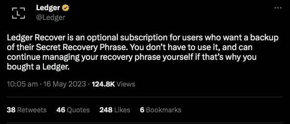 “O Recover é totalmente opcional e não é ativado automaticamente por nenhuma atualização de firmware. Sua Frase de Recuperação Secreta é gerada com segurança em seu dispositivo. Não temos acesso a ele”, acrescentou a empresa.