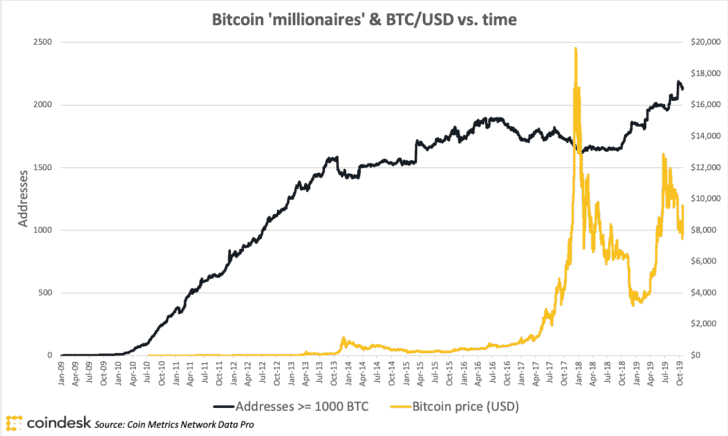 A Bitcoin Rich List, nome dado aos endereços que possuem mais de 1.000 Bitcoins sob custódia, registrou um crescimento de 30% desde setembro de 2018, de acordo com dados do site CoinMetrics.