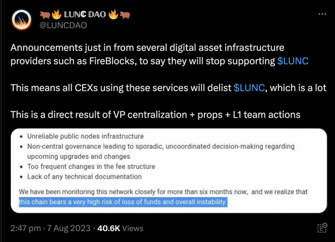 “Estamos monitorando essa rede de perto há mais de seis meses e percebemos que essa rede corre um risco muito alto de perda de fundos e instabilidade geral, disse a Fireblocks. A empresa culpa a centralização, propostas e ações da equipe da Força-Tarefa Joint L1, que levam ao risco de o LUNC sair de várias exchanges.